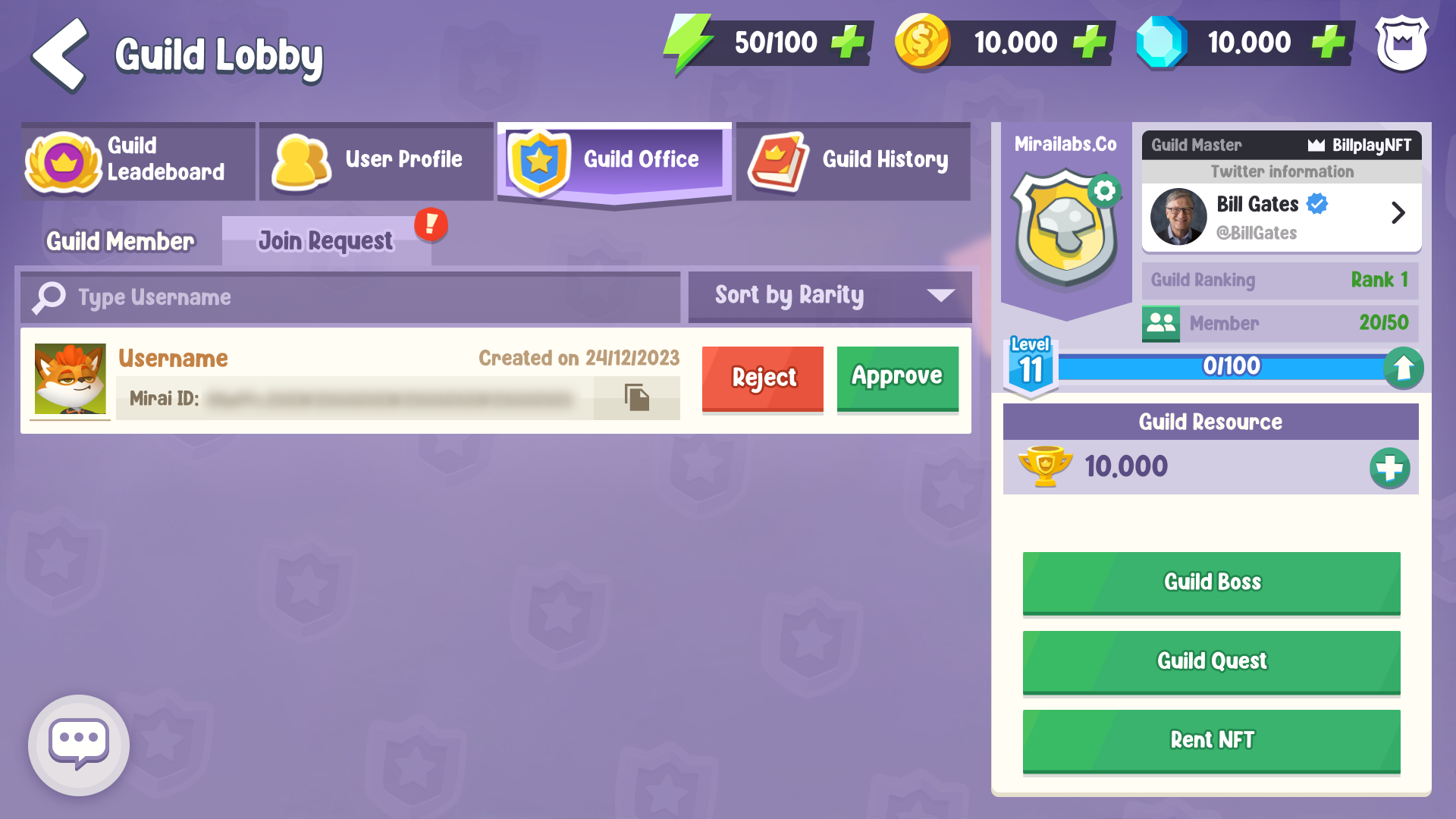 As a Guild Master, you can access the Guild Office and select [Join Request] to view players who have requested to join your guild. From there, you have the option to either approve or reject their application.